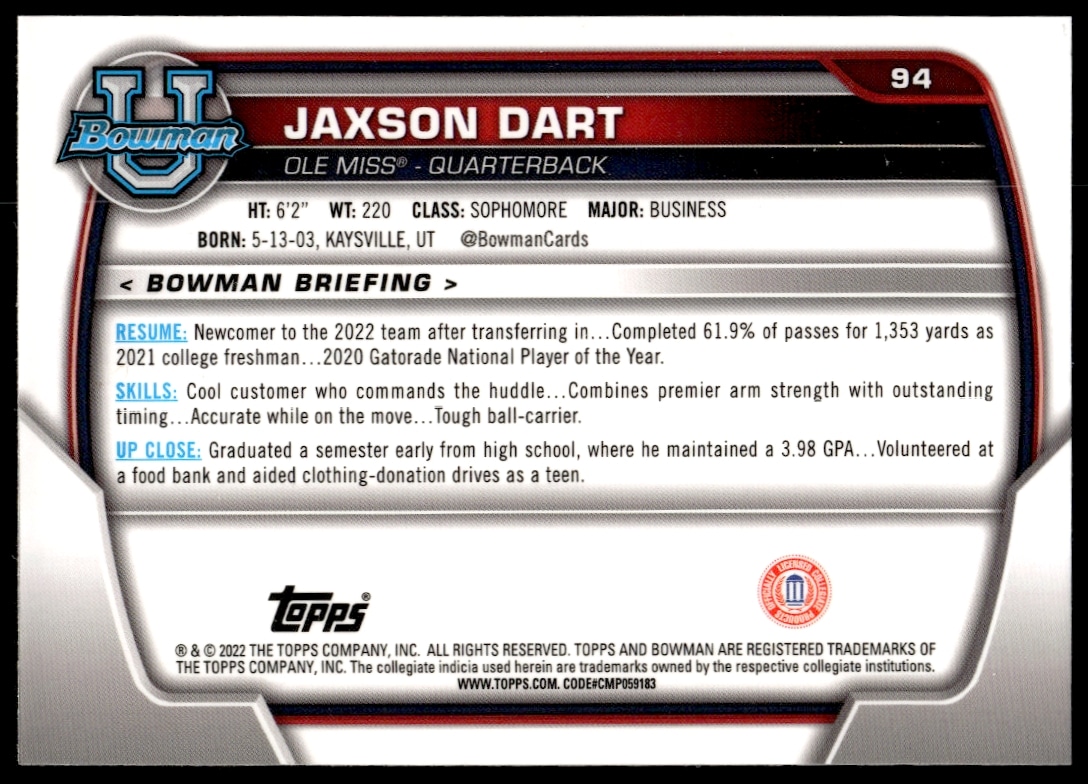 This Football card, from 2022 is part of the Bowman University Chrome card set. Cam Rising is featured and has a card number of 76.