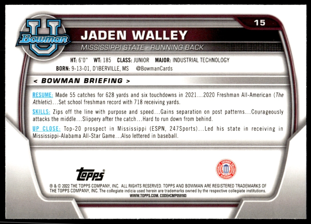 This Football card, from 2022 is part of the Bowman University Chrome card set. Jaden Walley is featured and has a card number of 15.
