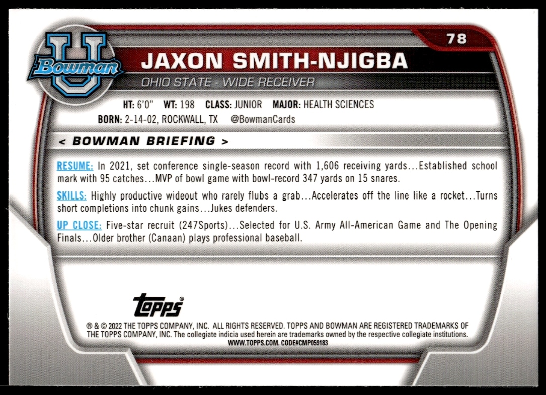 This Football card, from 2022 is part of the Bowman University Chrome card set. Jaxon Smith-Njigba is featured and has a card number of 78.