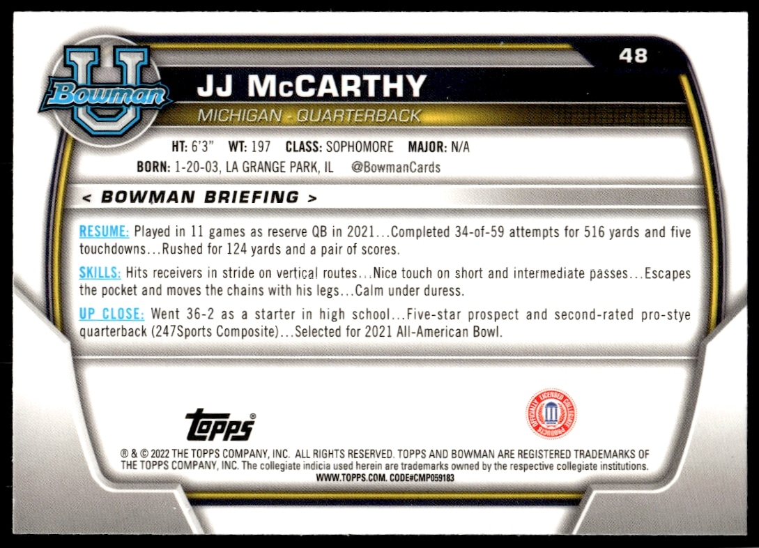 This Football card, from 2022 is part of the Bowman University Chrome card set. JJ McCarthy is featured and has a card number of 48.