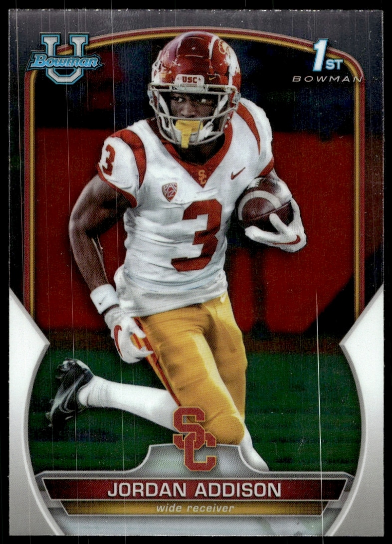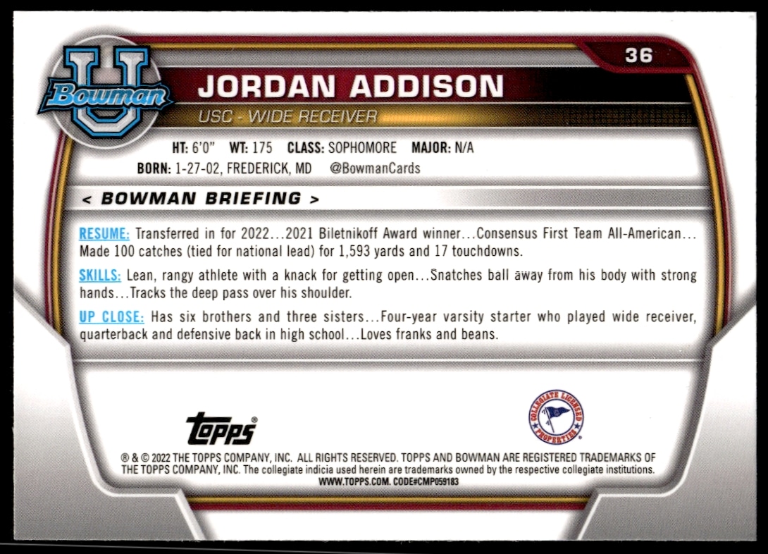 This Football card, from 2022 is part of the Bowman University Chrome card set. Jordan Addison is featured and has a card number of 36.
