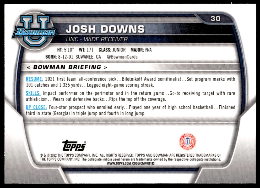 This Football card, from 2022 is part of the Bowman University Chrome card set. Josh Downs is featured and has a card number of 30.