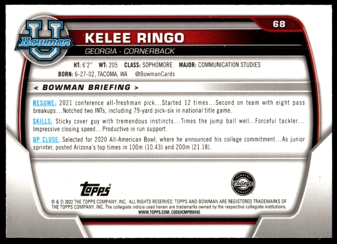 This Football card, from 2022 is part of the Bowman University Chrome card set. Kelee Ringo is featured and has a card number of 68.