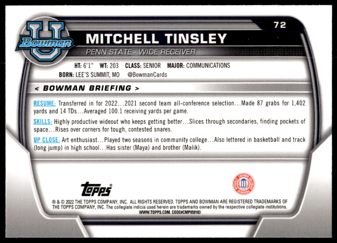 This Football card, from 2022 is part of the Bowman University Chrome card set. Mitchell Tinsley is featured and has a card number of 72.