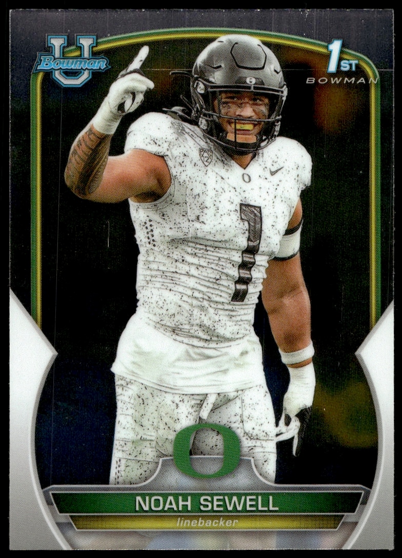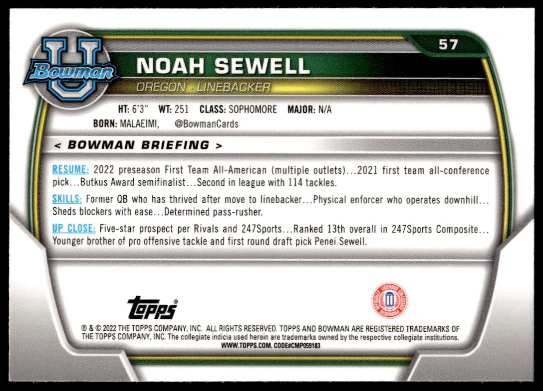 This Football card, from 2022 is part of the Bowman University Chrome card set. Noah Sewell is featured and has a card number of 57.