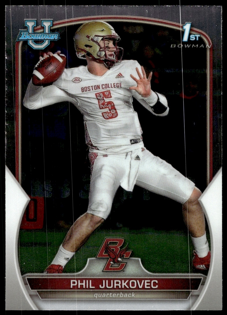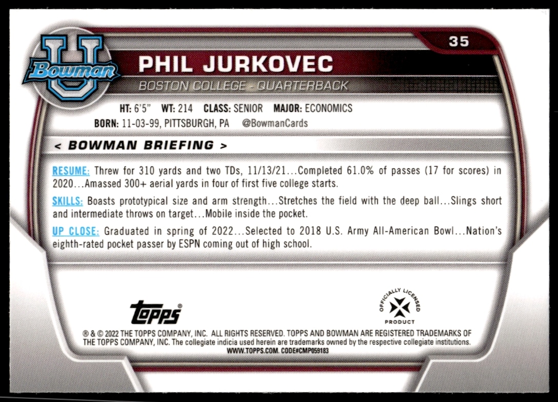 This Football card, from 2022 is part of the Bowman University Chrome card set. Phil Jurkovec is featured and has a card number of 35.