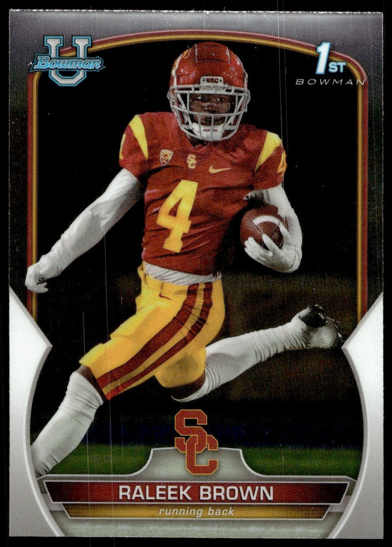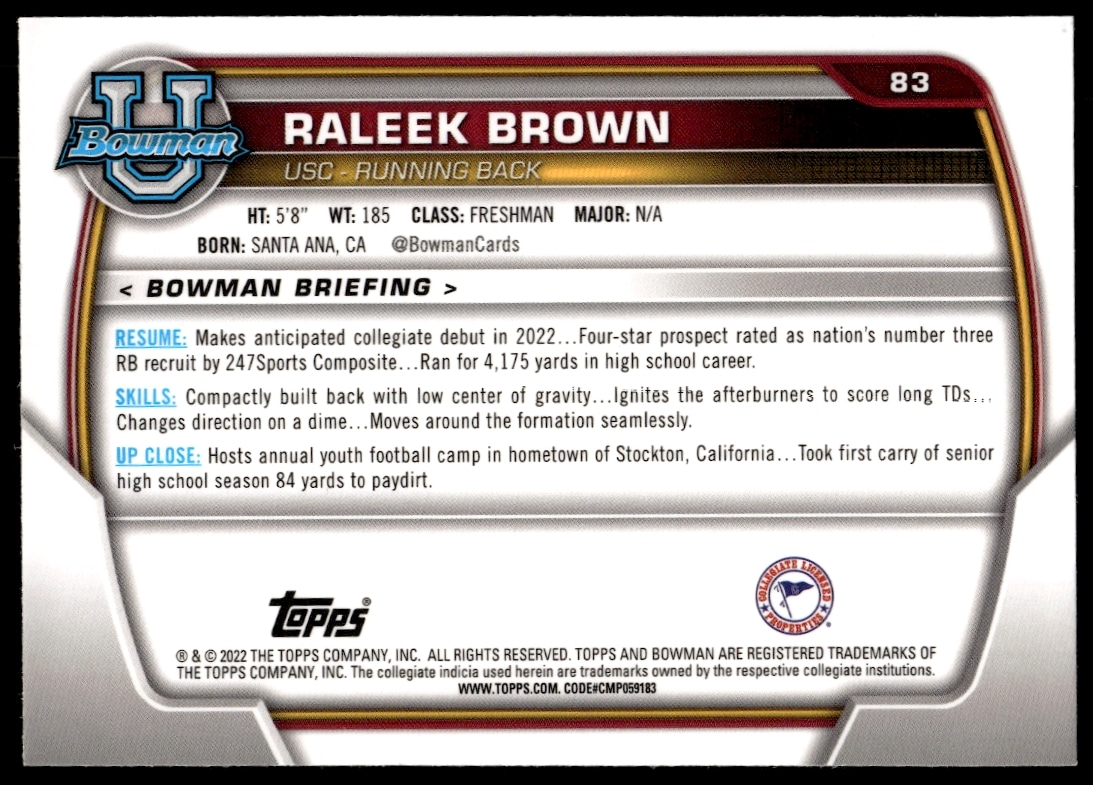 This Football card, from 2022 is part of the Bowman University Chrome card set. Raleek Brown is featured and has a card number of 83.