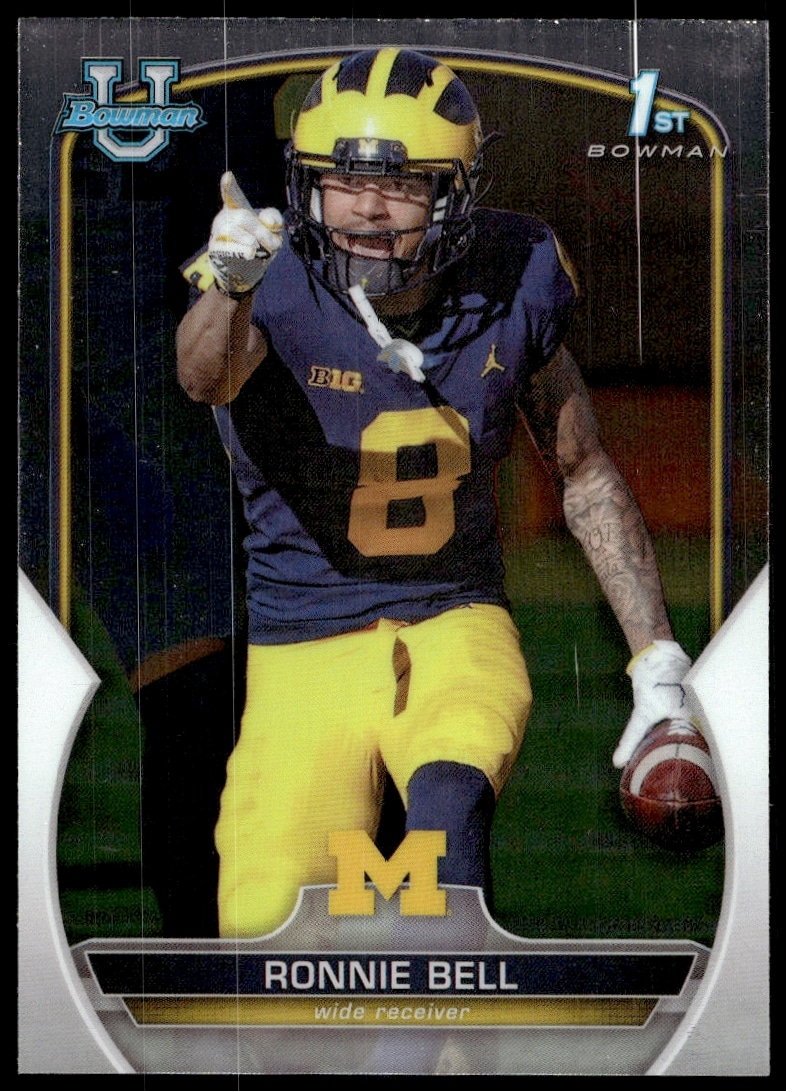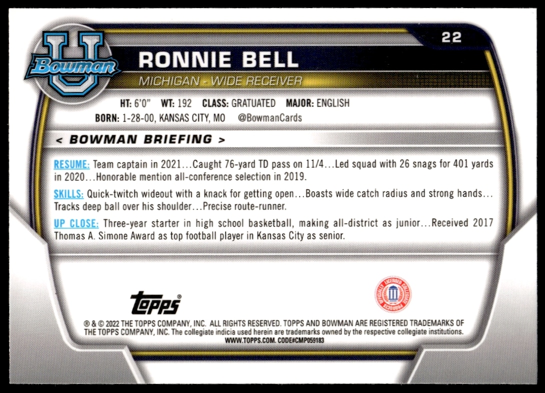 This Football card, from 2022 is part of the Bowman University Chrome card set. Ronnie Bell is featured and has a card number of 22.