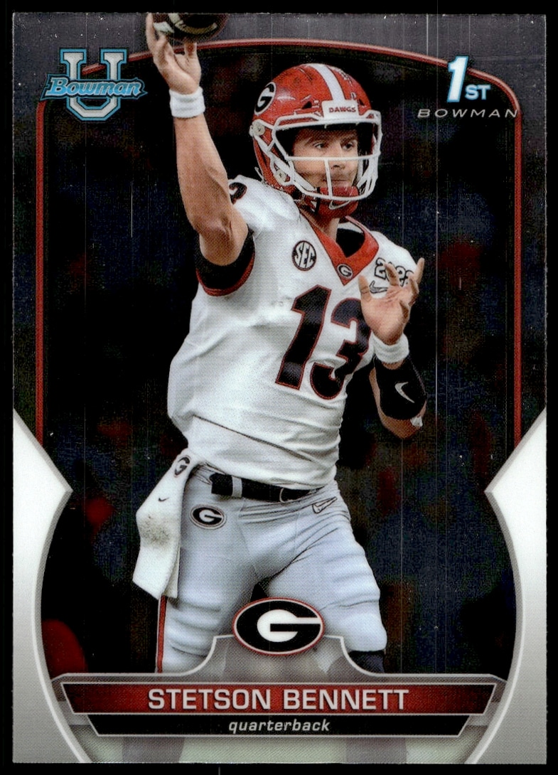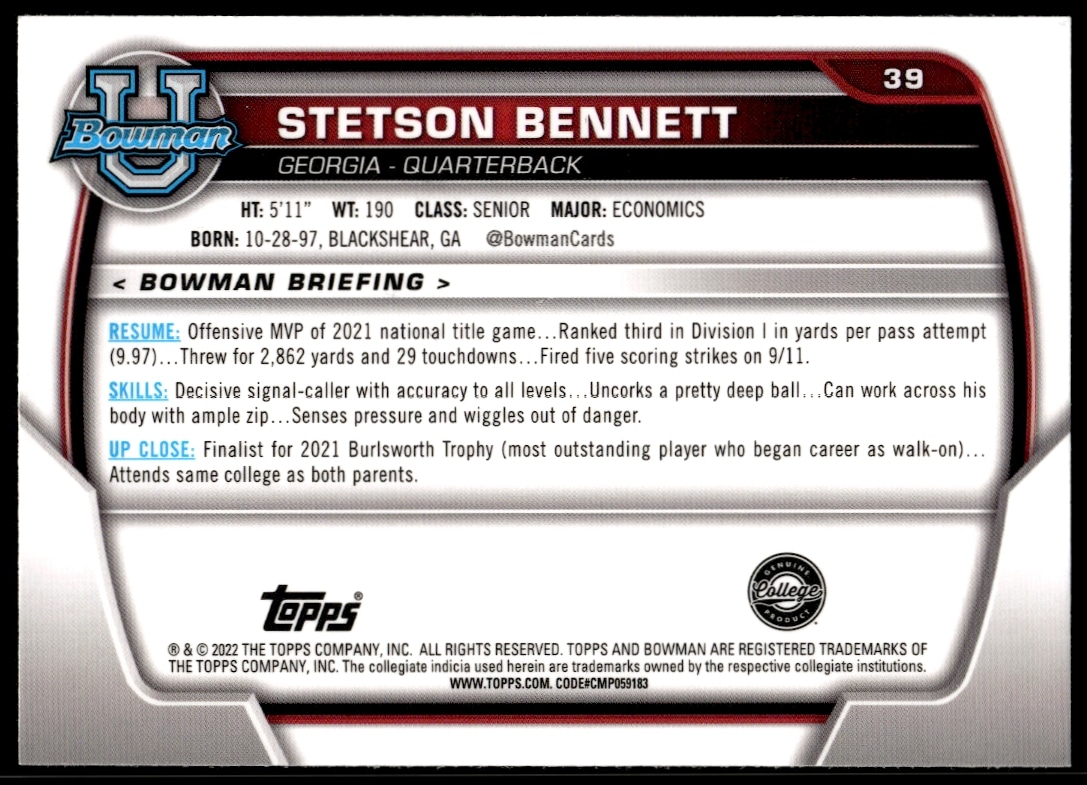 This Football card, from 2022 is part of the Bowman University Chrome card set. Stetson Bennett is featured and has a card number of 39.
