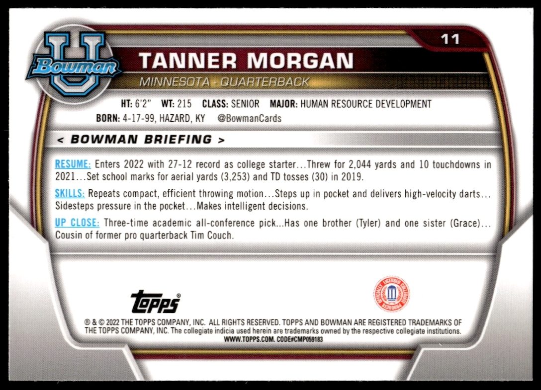 This Football card, from 2022 is part of the Bowman University Chrome card set. Tanner Morgan is featured and has a card number of 11.