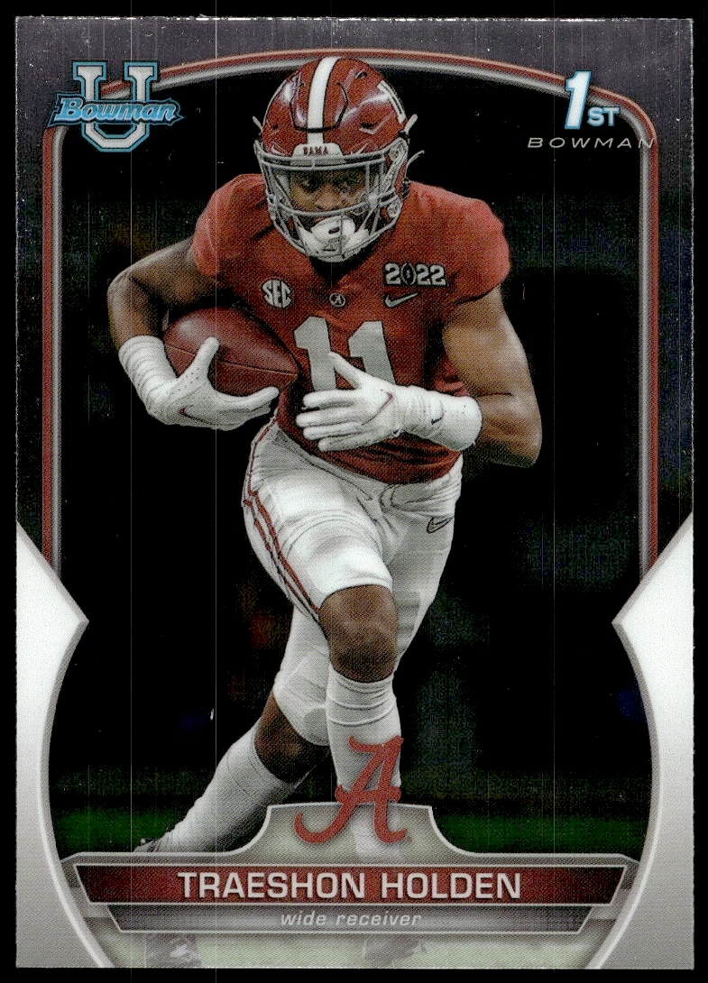 This Football card, from 2022 is part of the Bowman University Chrome card set. Traeshon Holden is featured and has a card number of 18.
