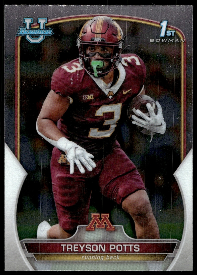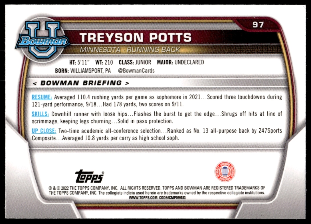 This Football card, from 2022 is part of the Bowman University Chrome card set. Treyson Potts is featured and has a card number of 97.