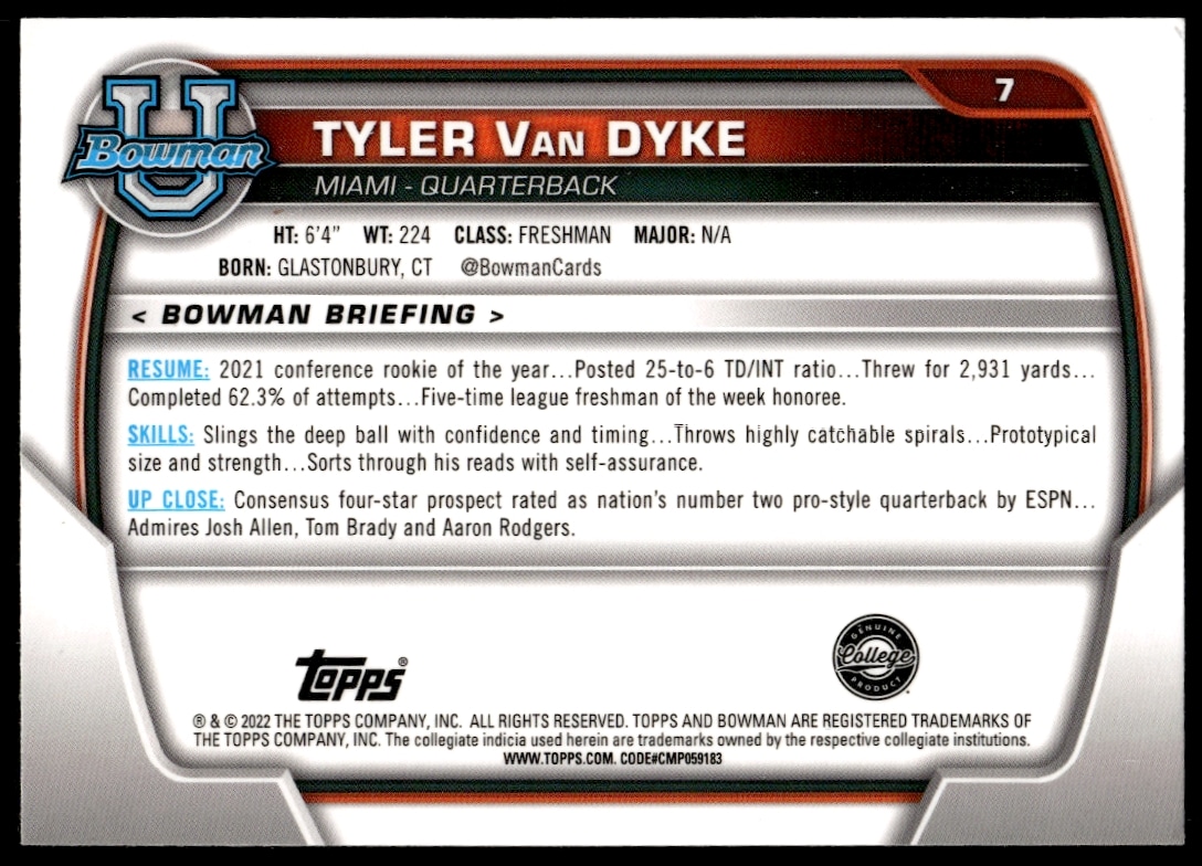 This Football card, from 2022 is part of the Bowman University Chrome card set. Tyler Van Dyke is featured and has a card number of 7.