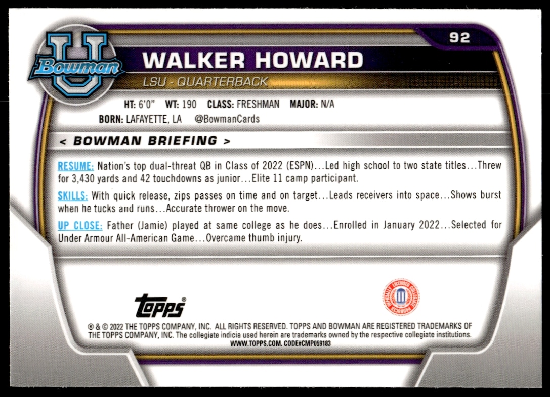 This Football card, from 2022 is part of the Bowman University Chrome card set. Walker Howard is featured and has a card number of 92.
