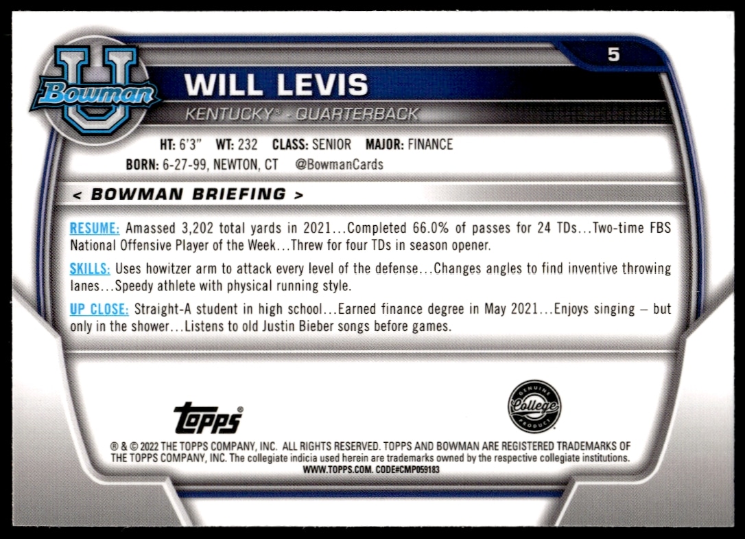 This Football card, from 2022 is part of the Bowman University Chrome card set. Will Levis is featured and has a card number of 5.