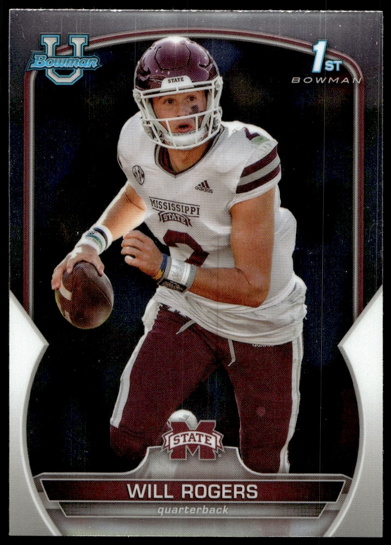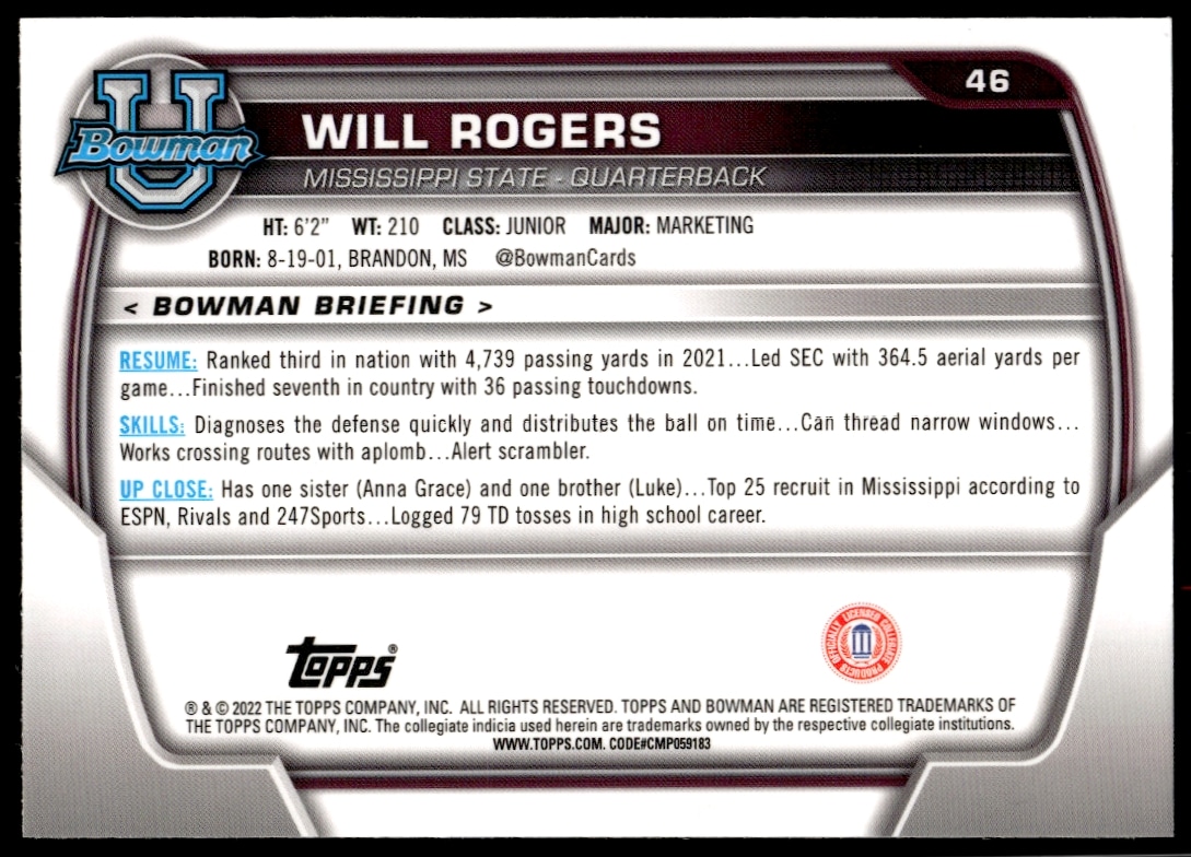 This Football card, from 2022 is part of the Bowman University Chrome card set. Will Rogers is featured and has a card number of 46.