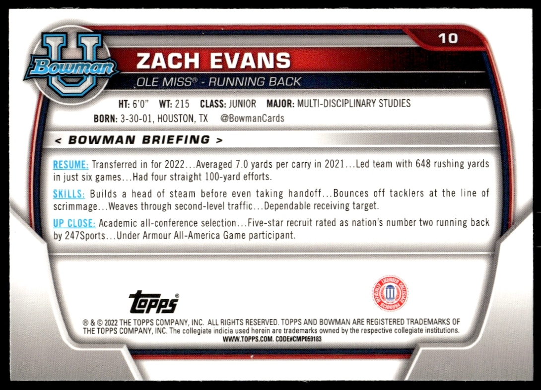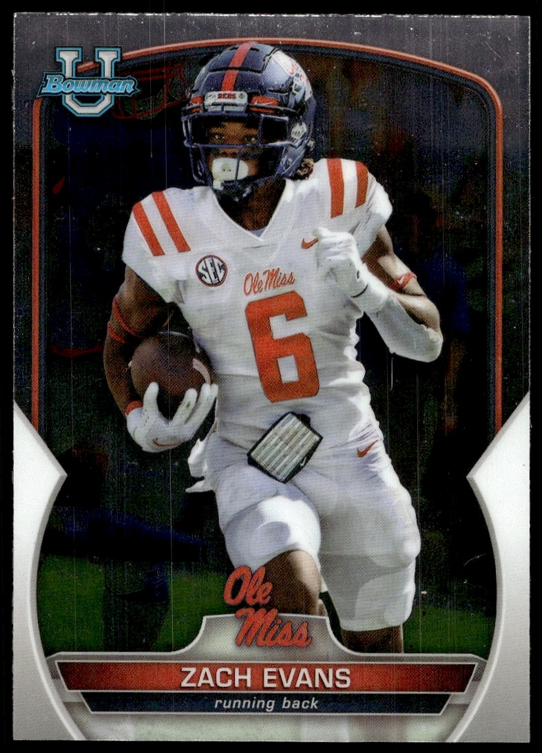 This Football card, from 2022 is part of the Bowman University Chrome card set. Zach Evans is featured and has a card number of 10.