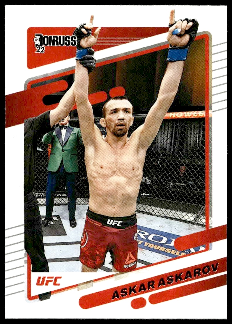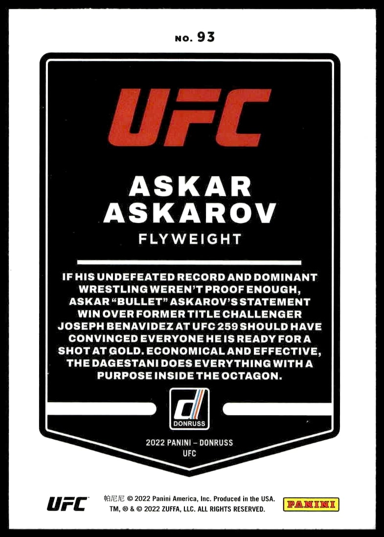 This MMA card, from 2022 is part of the Donruss UFC card set. Askar Askarov is featured and has a card number of 93.