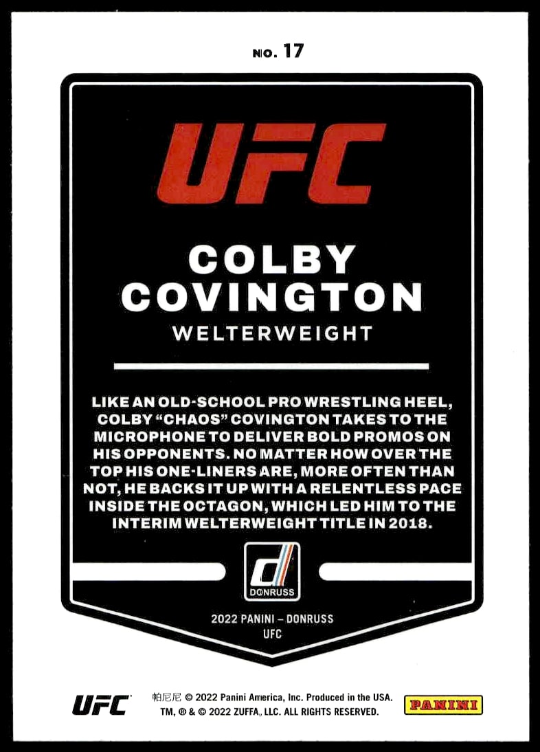 This MMA card, from 2022 is part of the Donruss UFC card set. Colby Covington is featured and has a card number of 17.