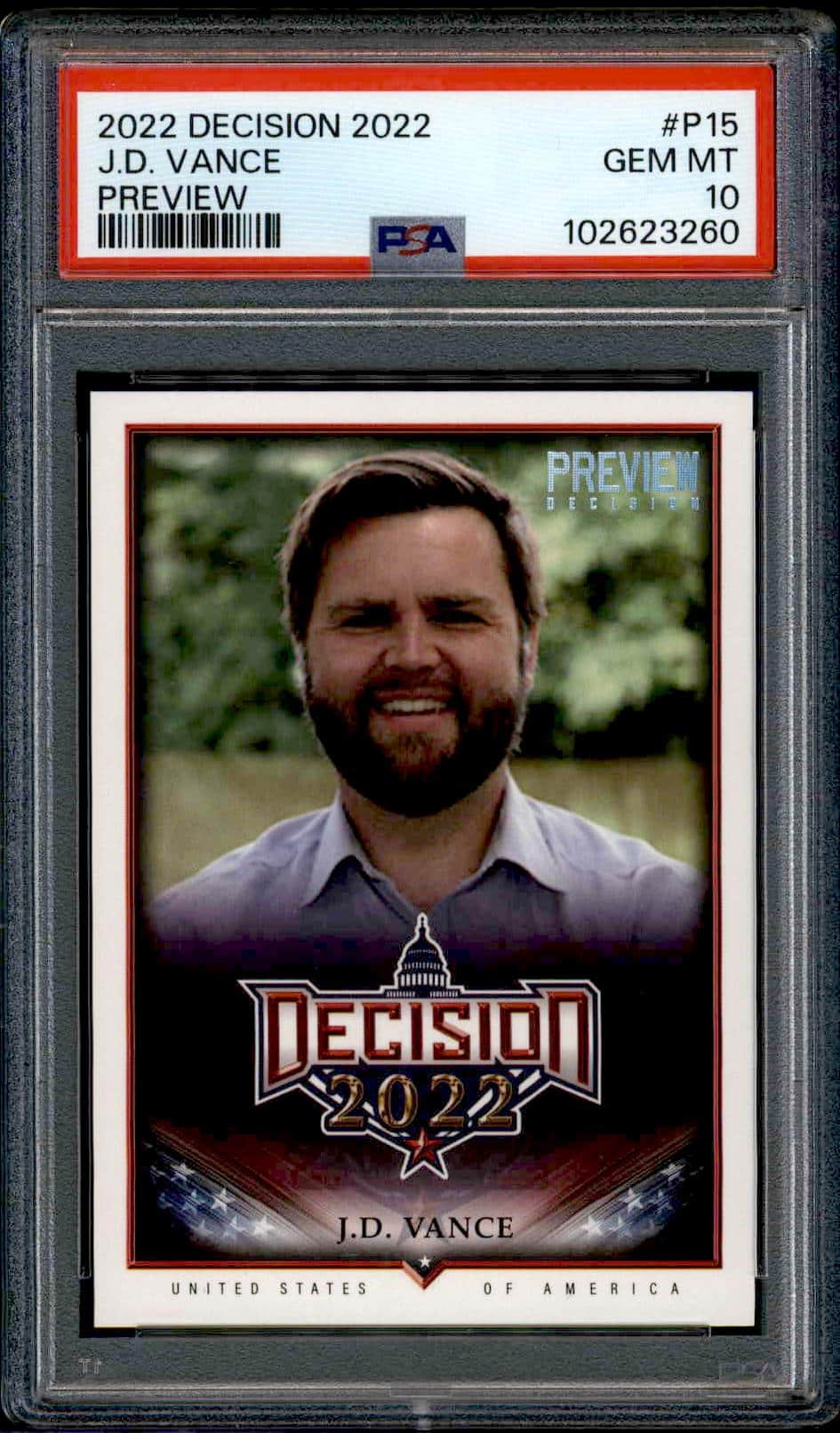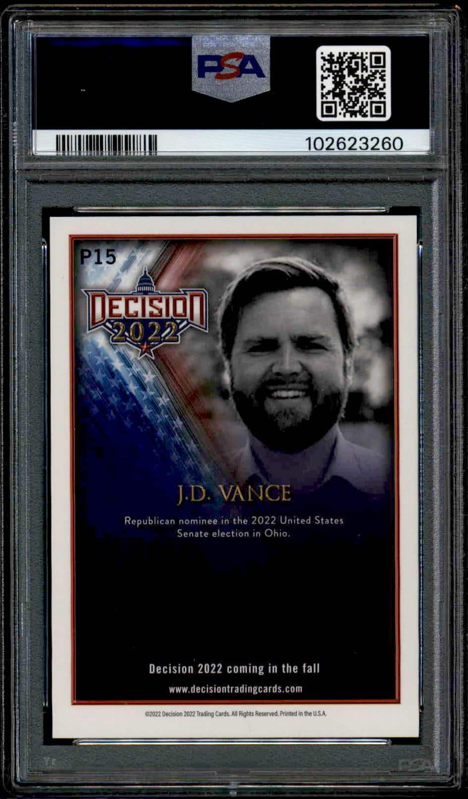 This Political card, from 2022 is part of the Leaf Decision card set. J.D. Vance is featured and has a card number of P15. It is graded by PSA and has a numeric grade of 10.