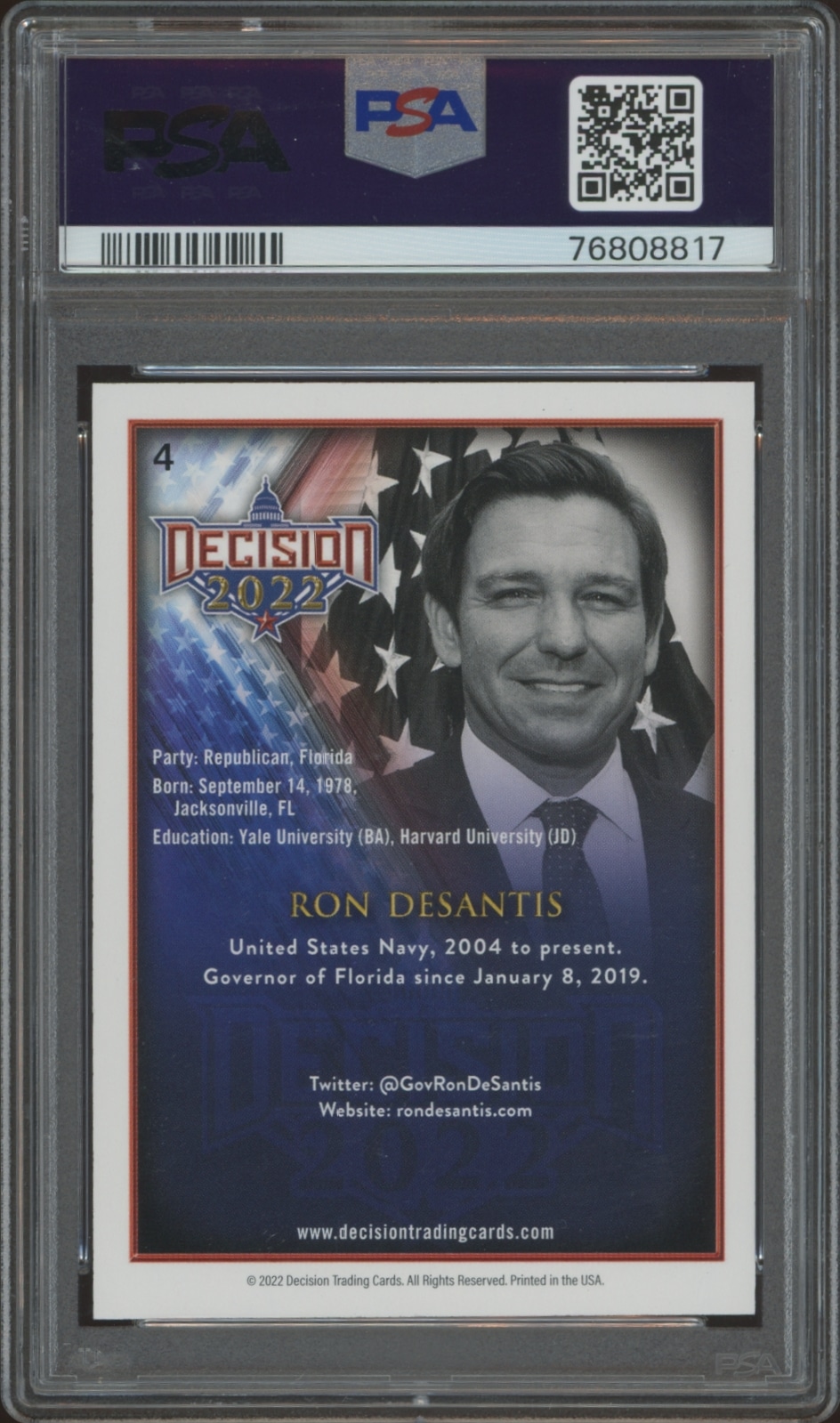 This Political card, from 2022 is part of the Leaf Decision card set. Ron Desantis is featured and has a card number of 4. It is graded by PSA and has a numeric grade of 9.