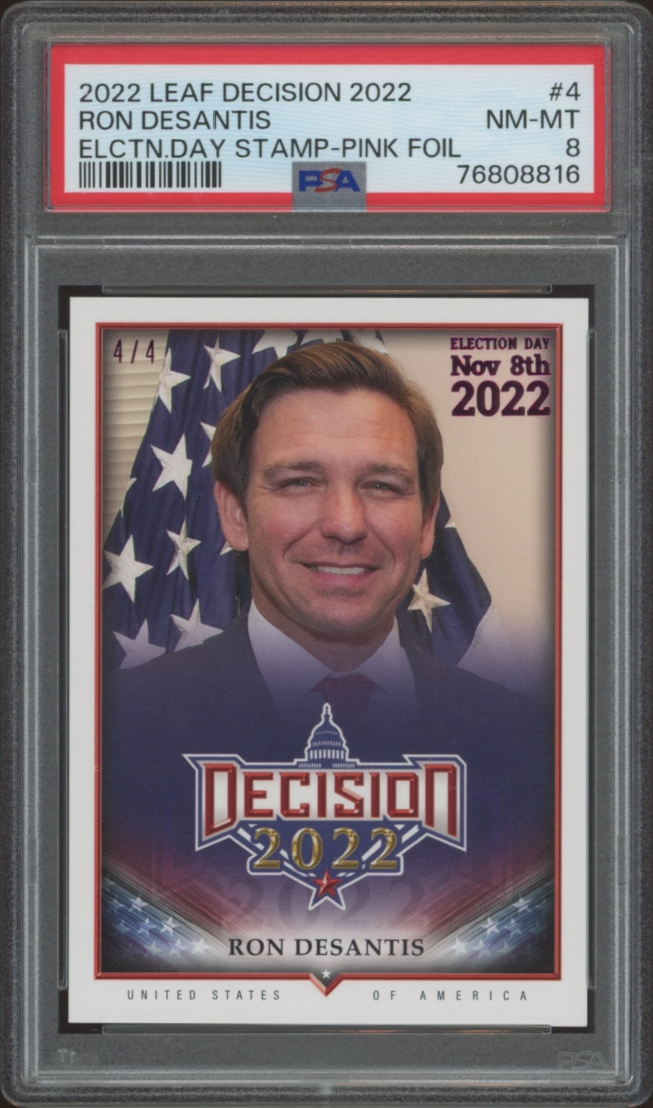 Collect this rare 2022 Leaf Ron DeSantis Election Day stamp in pink foil, graded PSA 8, perfect for any political memorabilia enthusiast.