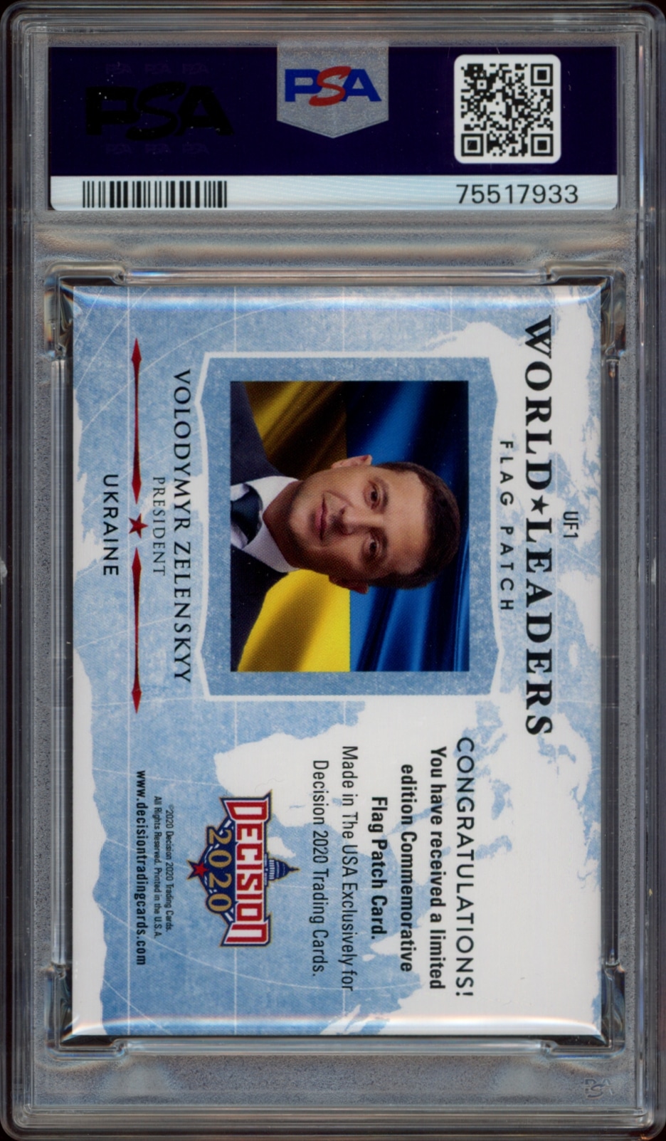 This Political card, from 2022 is part of the Leaf Decision card set. Volodymyr Zelenskyy is featured and has a card number of UF1. It is graded by PSA and has a numeric grade of 9.