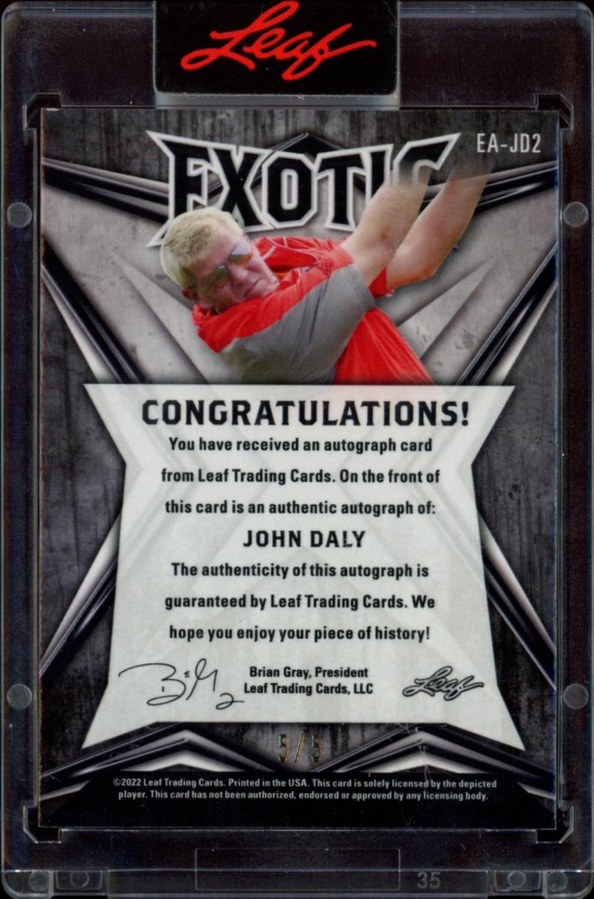 This Golf card, from 2022 is part of the Leaf Exotic card set. John Daly is featured and has a card number of EA-JD2.