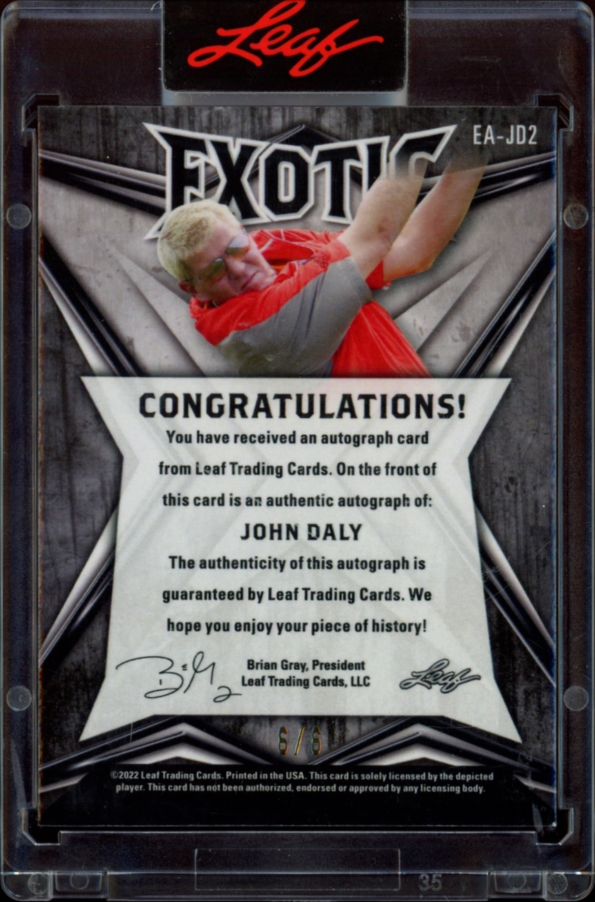 This Golf card, from 2022 is part of the Leaf Exotic card set. John Daly is featured and has a card number of EA-JD2.