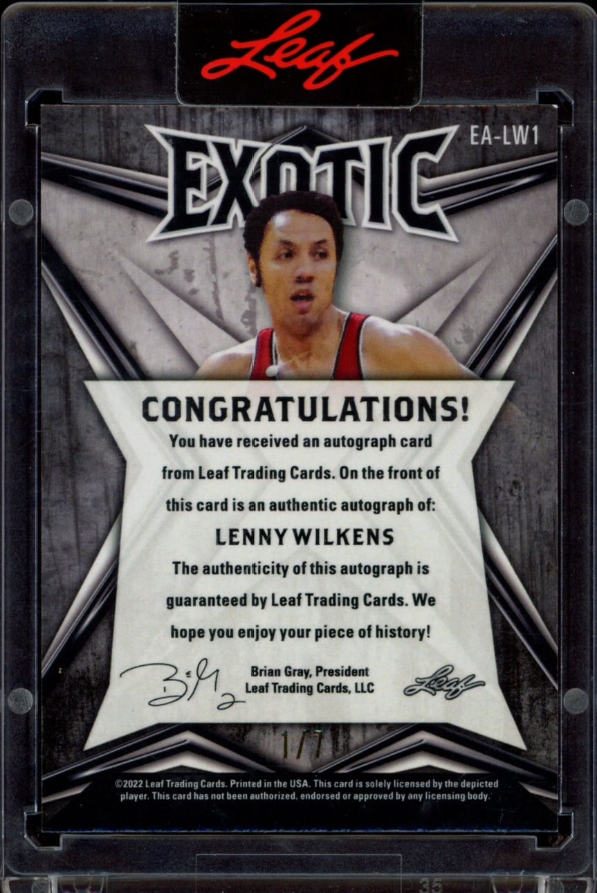 This Basketball card, from 2022 is part of the Leaf Exotic card set. Lenny Wilkens is featured and has a card number of EA-LW1.