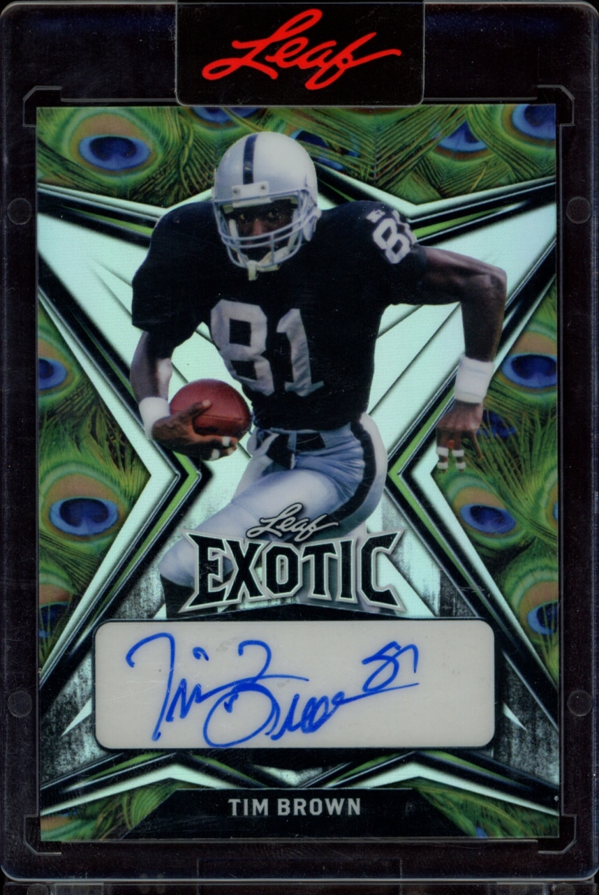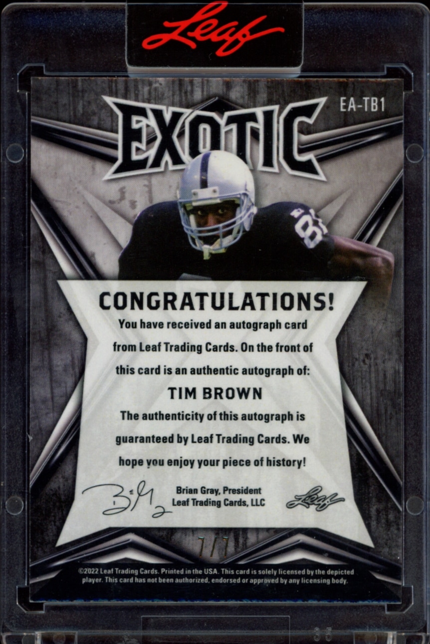This Football card, from 2022 is part of the Leaf Exotic card set. Tim Brown is featured and has a card number of EA-TB1.