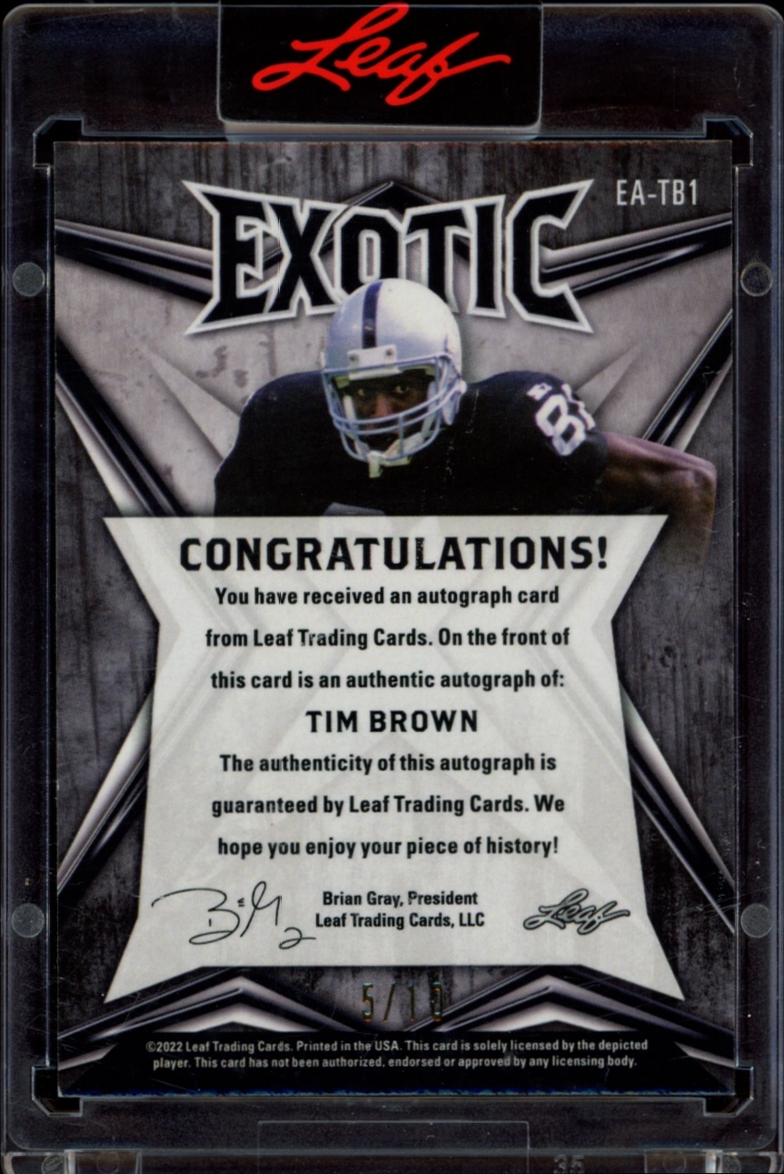 This Football card, from 2022 is part of the Leaf Exotic card set. Tim Brown is featured and has a card number of EA-TB1.