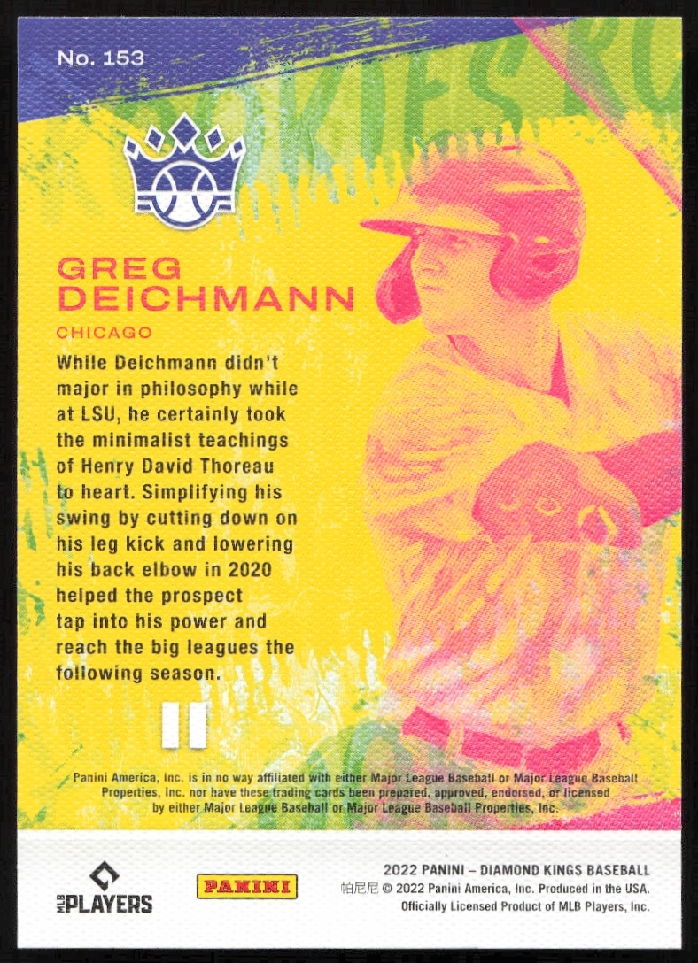 This Baseball card, from 2022 is part of the Panini Diamond Kings card set. Greg Deichmann is featured and has a card number of 153.