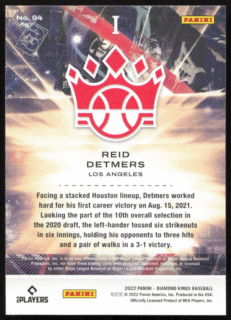 This Baseball card, from 2022 is part of the Panini Diamond Kings card set. Reid Detmers is featured and has a card number of 94.