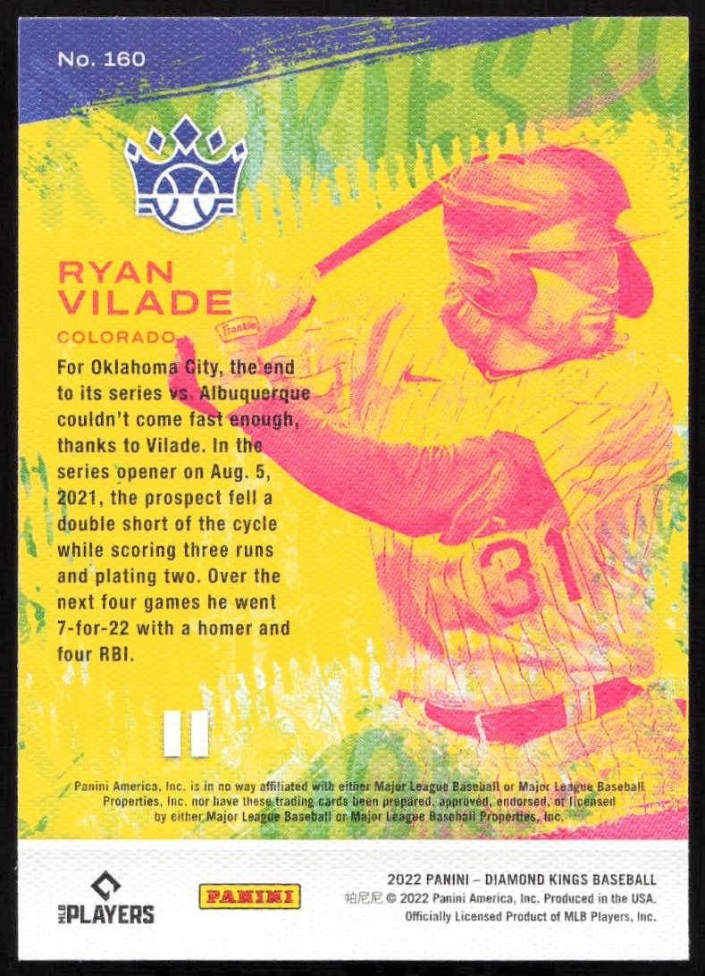 This Baseball card, from 2022 is part of the Panini Diamond Kings card set. Ryan Vilade is featured and has a card number of 160.