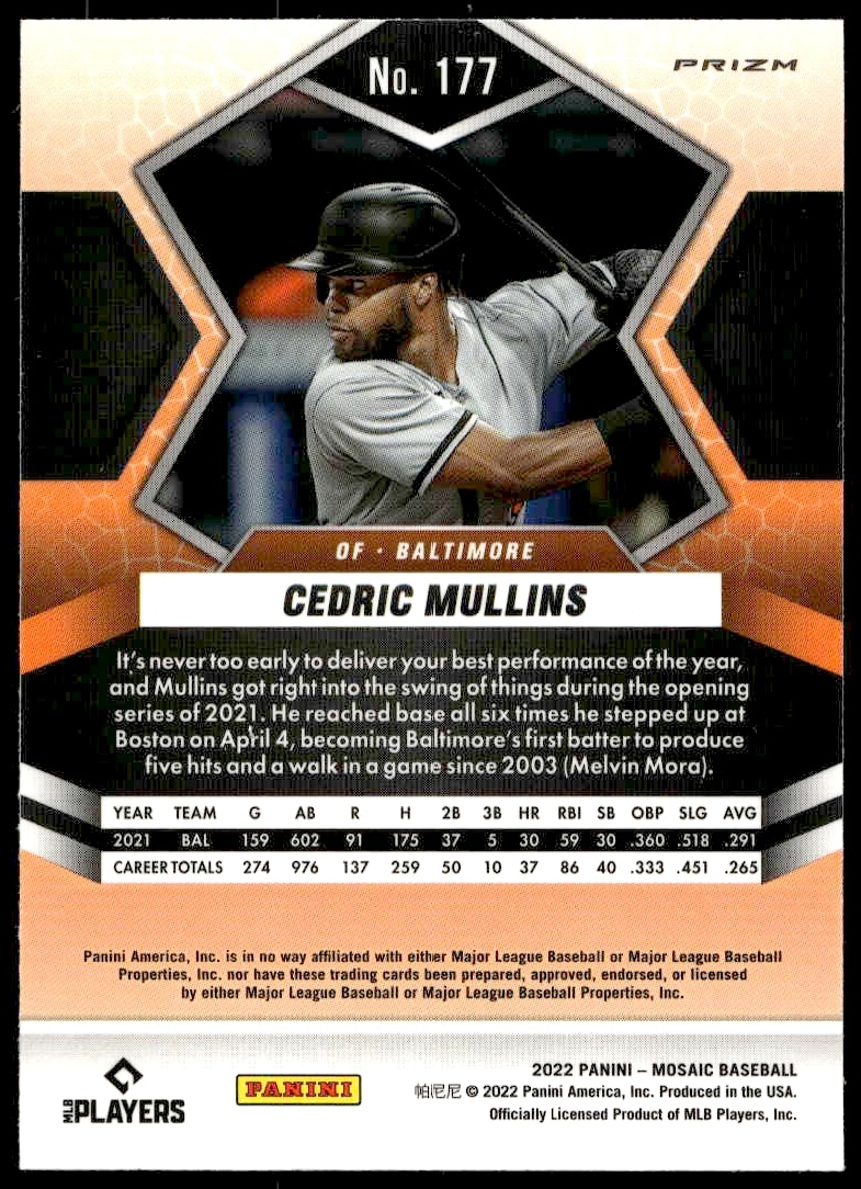 This Baseball card, from 2022 is part of the Panini Mosaic card set. Cedric Mullins is featured and has a card number of 177.