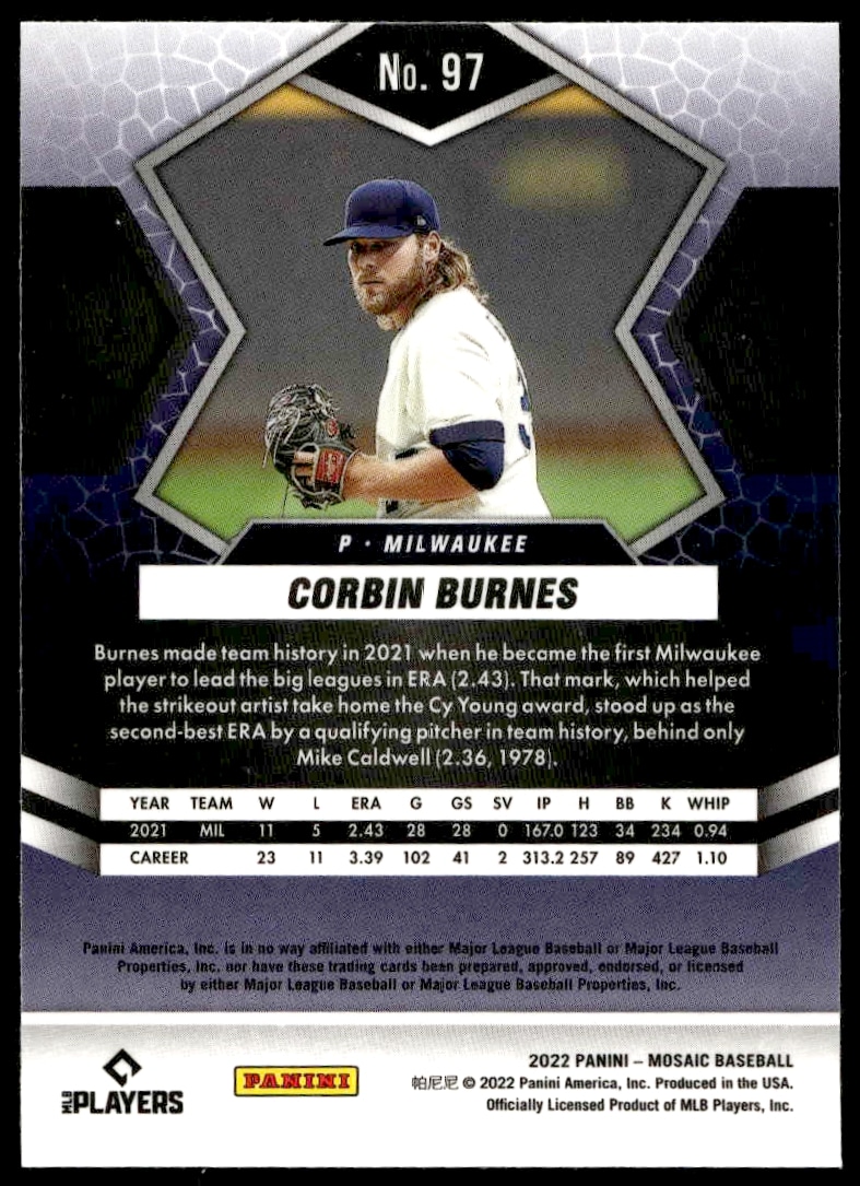 This Baseball card, from 2022 is part of the Panini Mosaic card set. Corbin Burnes is featured and has a card number of 97.