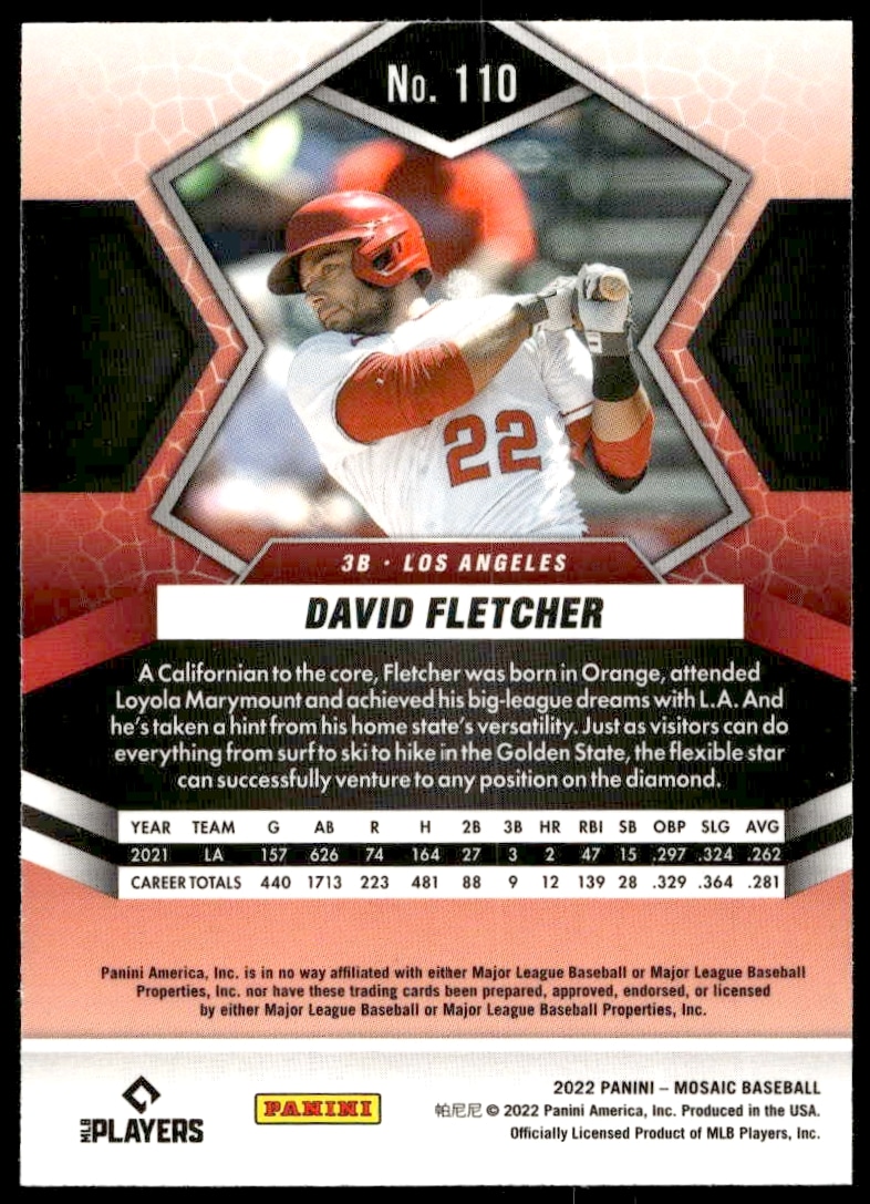 This Baseball card, from 2022 is part of the Panini Mosaic card set. David Fletcher is featured and has a card number of 110.