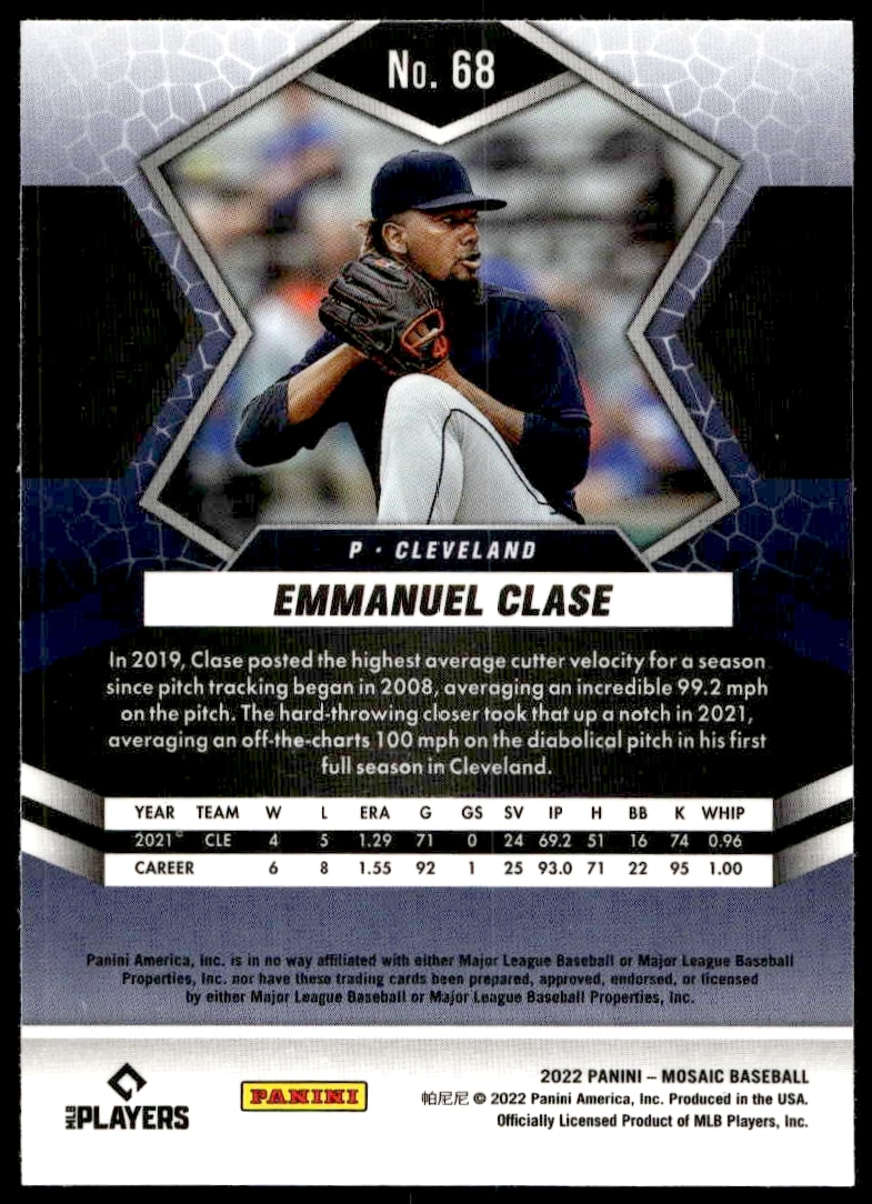 This Baseball card, from 2022 is part of the Panini Mosaic card set. Emmanuel Clase is featured and has a card number of 68.