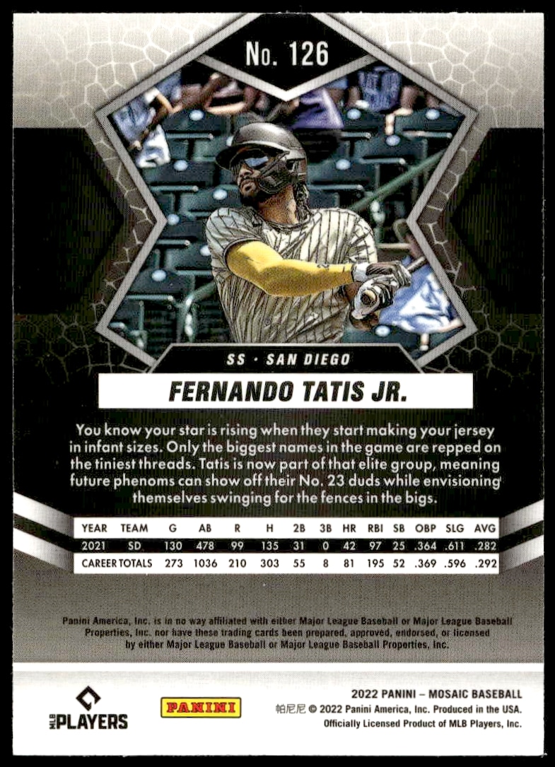 This Baseball card, from 2022 is part of the Panini Mosaic card set. Fernando Tatis Jr. is featured and has a card number of 126.