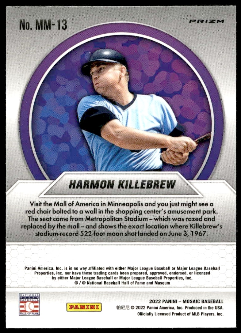 This Baseball card, from 2022 is part of the Panini Mosaic card set. Harmon Killebrew is featured and has a card number of MM-13.