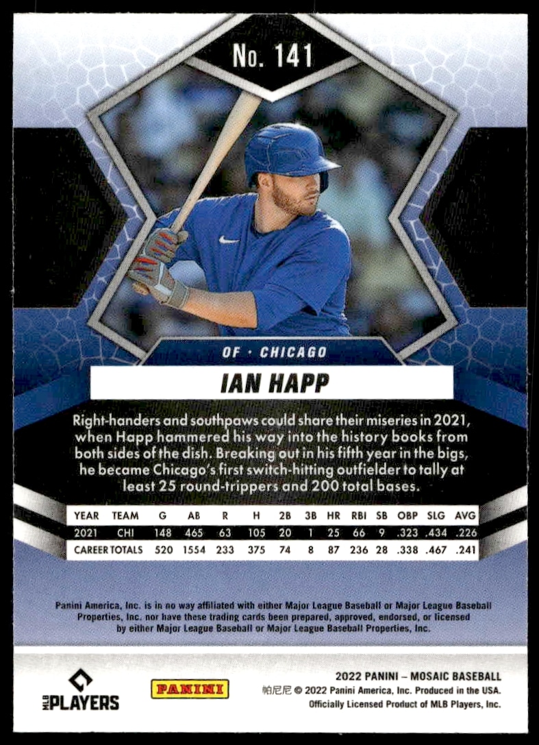 This Baseball card, from 2022 is part of the Panini Mosaic card set. Ian Happ is featured and has a card number of 141.