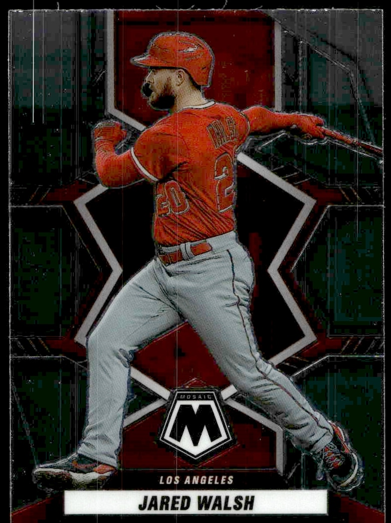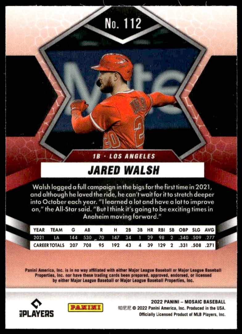 This Baseball card, from 2022 is part of the Panini Mosaic card set. Jared Walsh is featured and has a card number of 112.