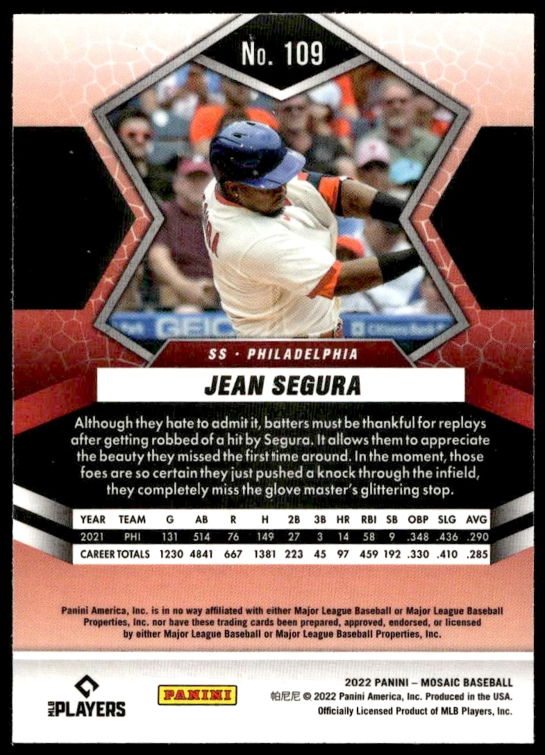 This Baseball card, from 2022 is part of the Panini Mosaic card set. Jean Segura is featured and has a card number of 109.