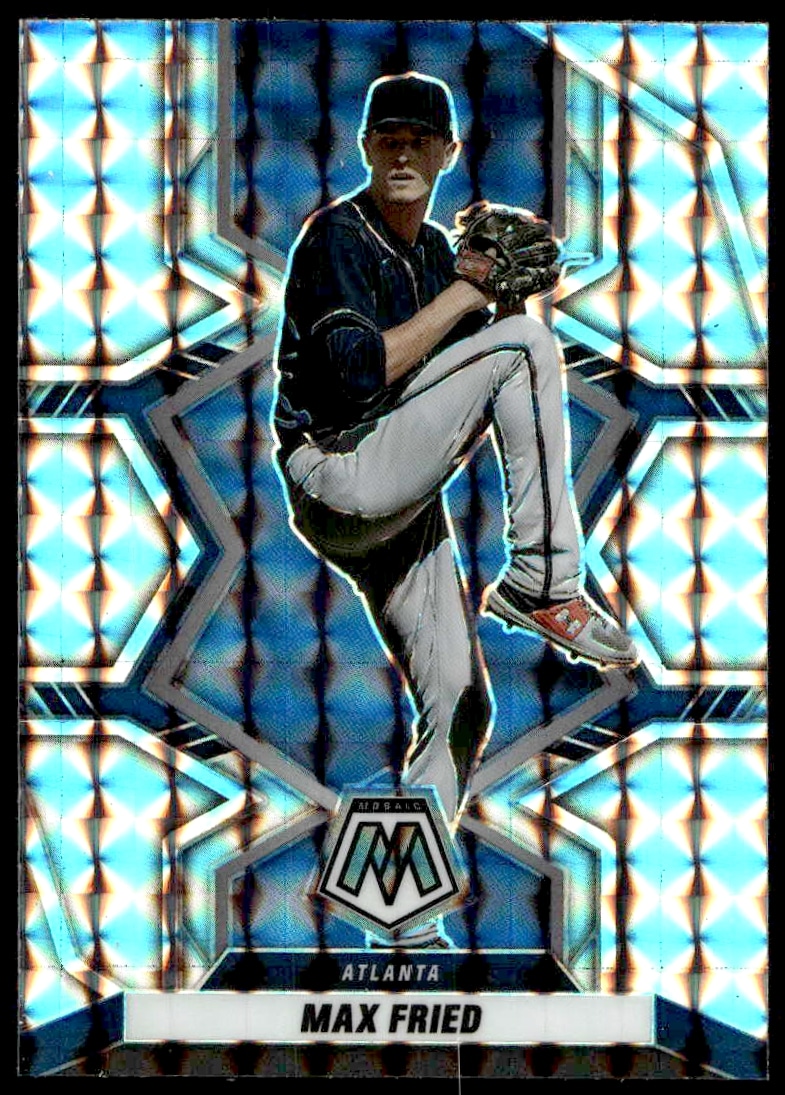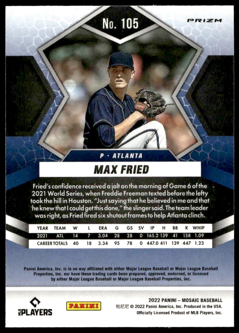 This Baseball card, from 2022 is part of the Panini Mosaic card set. Max Fried is featured and has a card number of 105.
