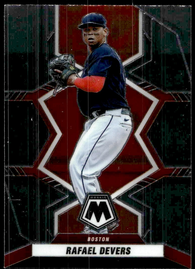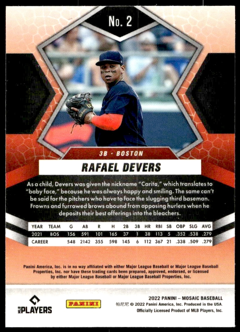 This Baseball card, from 2022 is part of the Panini Mosaic card set. Rafael Devers is featured and has a card number of 2.