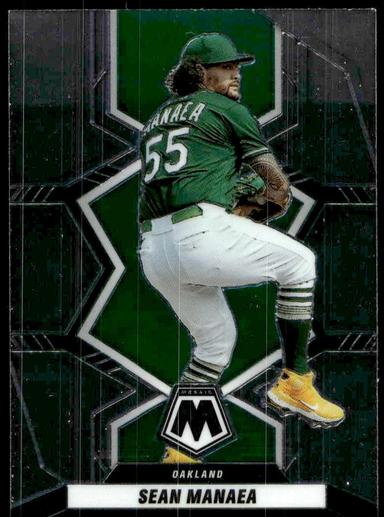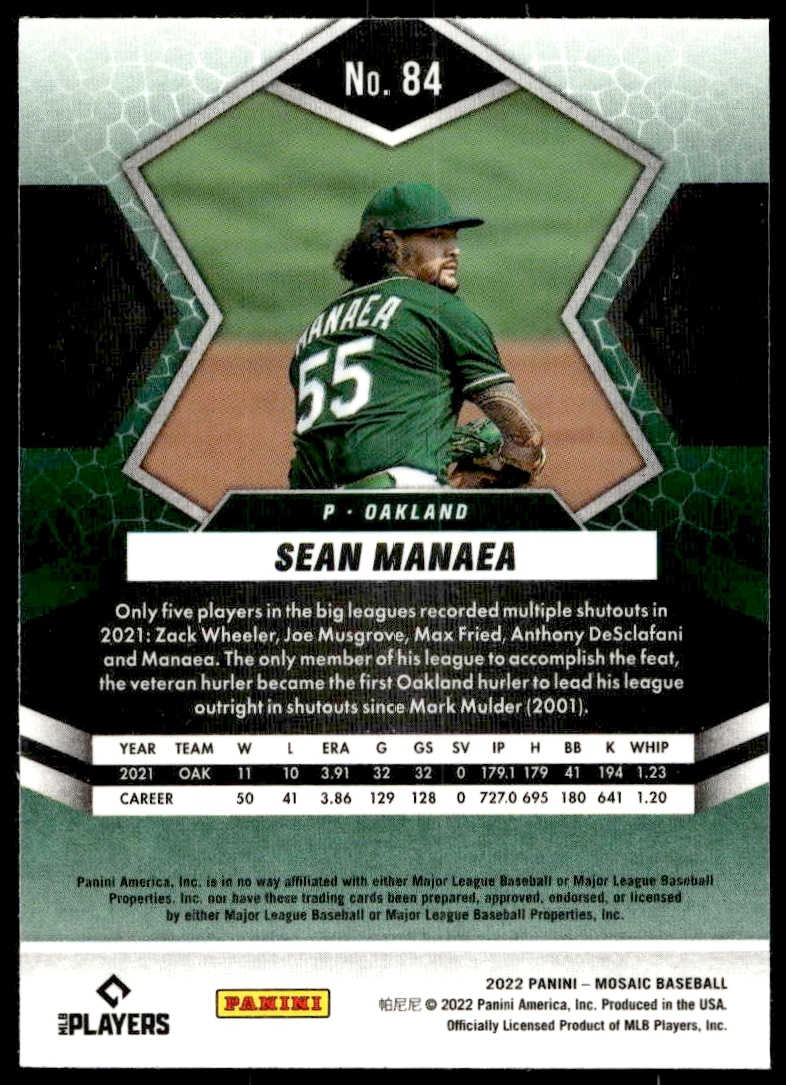 This Baseball card, from 2022 is part of the Panini Mosaic card set. Sean Manaea is featured and has a card number of 84.