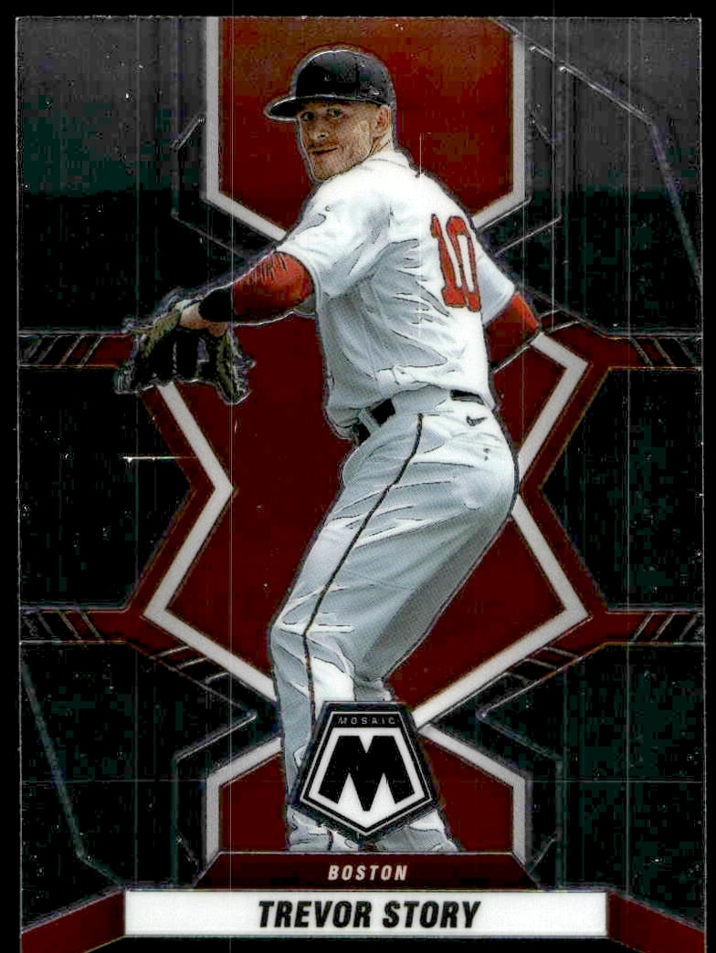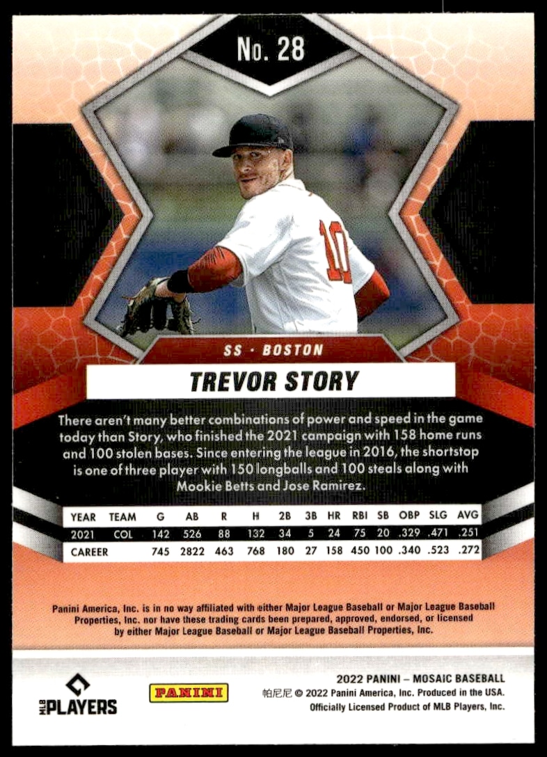 This Baseball card, from 2022 is part of the Panini Mosaic card set. Trevor Story is featured and has a card number of 28.