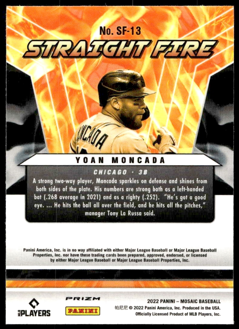 This Baseball card, from 2022 is part of the Panini Mosaic card set. Yoan Moncada is featured and has a card number of SF-13.