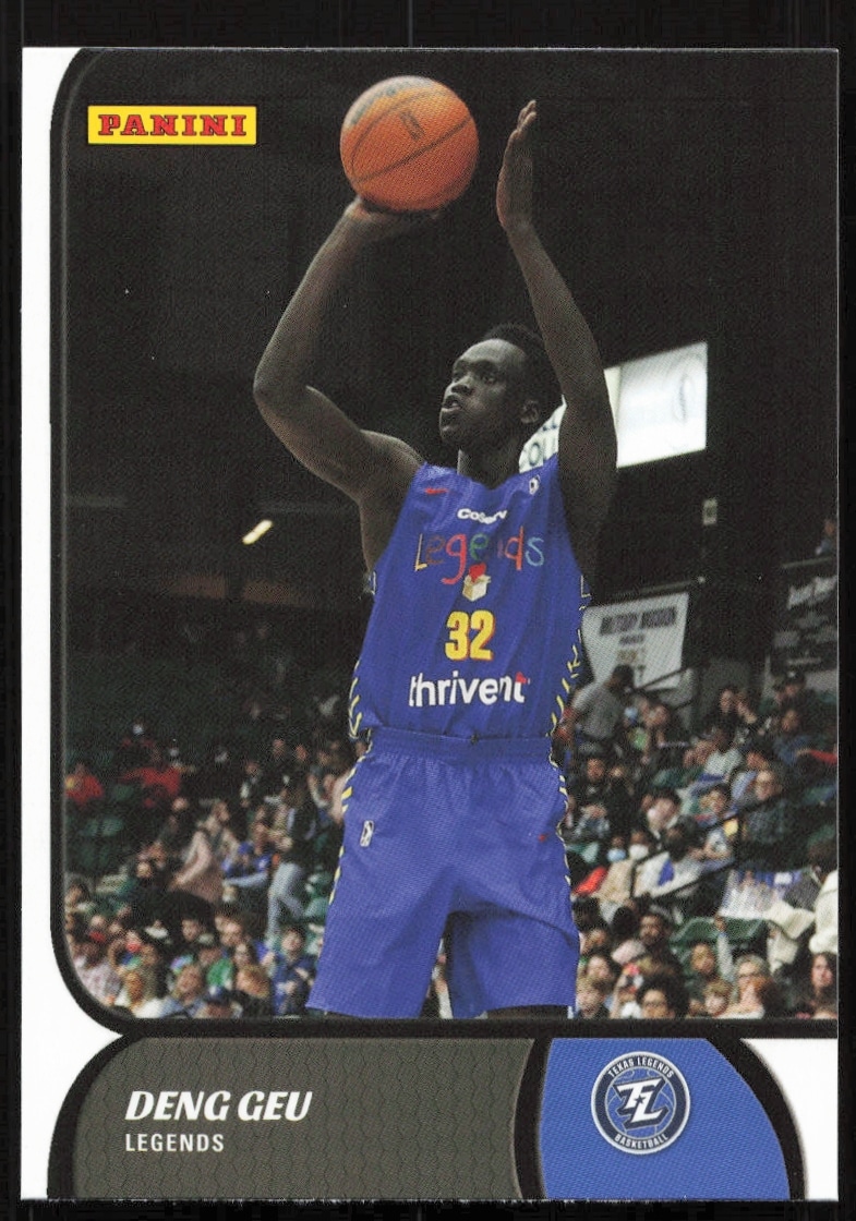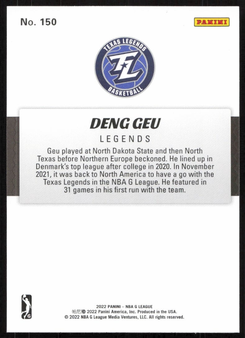 This Basketball card, from 2022 is part of the Panini NBA G League card set. Deng Geu is featured and has a card number of 150.